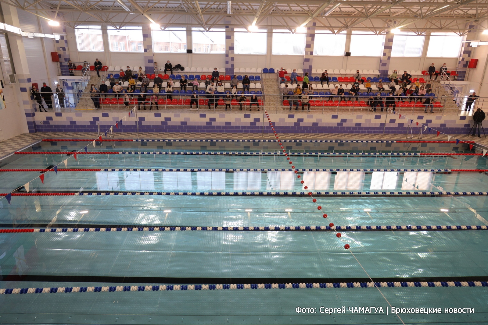 Трибуны на 300 мест огорожены перилами из нержавейки. Высота самого бассейна впечатляет — самая высокая точка — одиннадцать метров, потом постепенно снижается до семи с половиной.