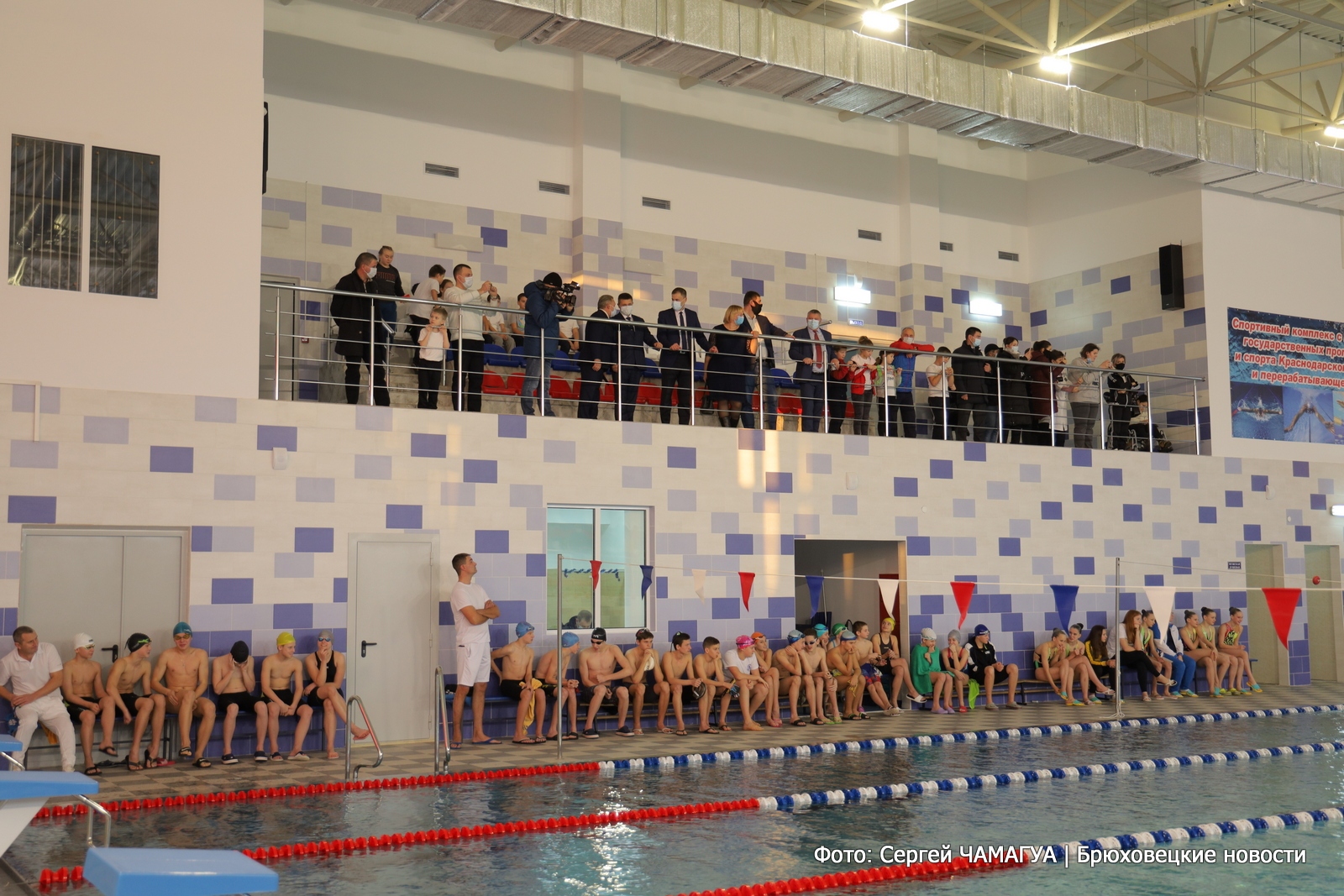 Первыми нарушили водную гладь в бассейне воспитанники ДЮСШ станицы Брюховецкой по сигналу замглавы администрации Краснодарского края Александра Власова.