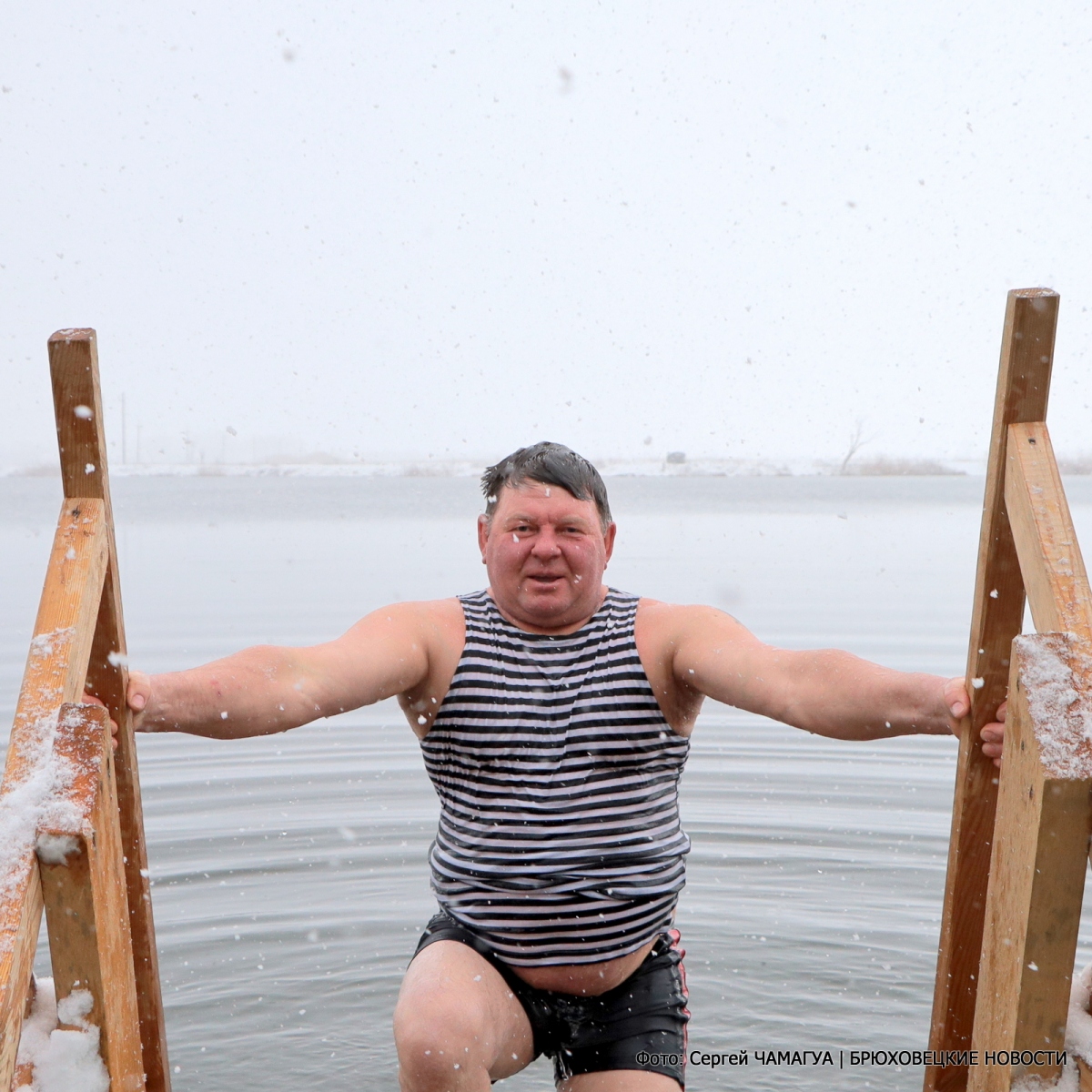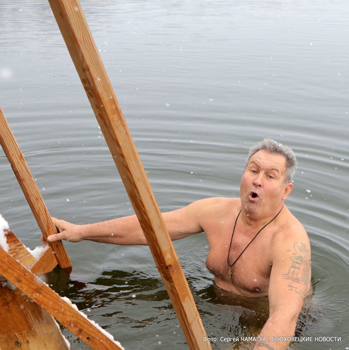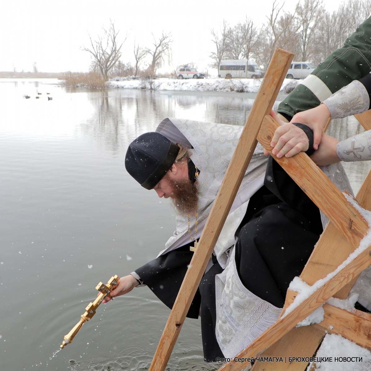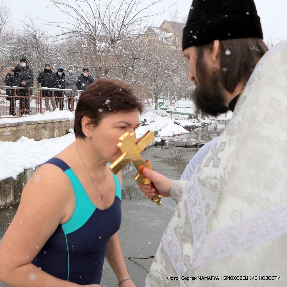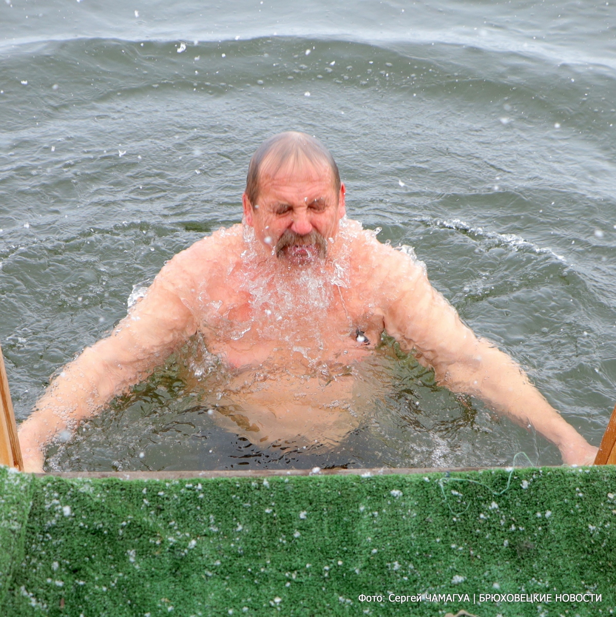 Священнослужители провели освящение воды, благочинный Брюховецкого церковного округа протоиерей Родион Драпов прочитал молитву и поздравил всех с праздником Богоявления. С молитвой, перекрестившись, все желающие трижды окунались в воду и выходили из нее с улыбками.