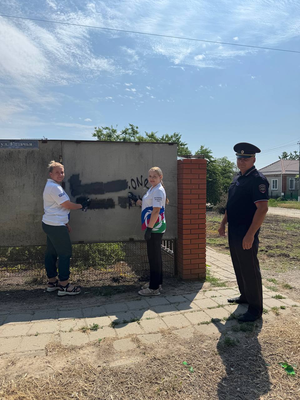 Волонтёры под контролем сотрудника полиции удалили надписи с рекламой пронаркотического содержания с помощью краски с целью популяризации и ведения здорового образа жизни на