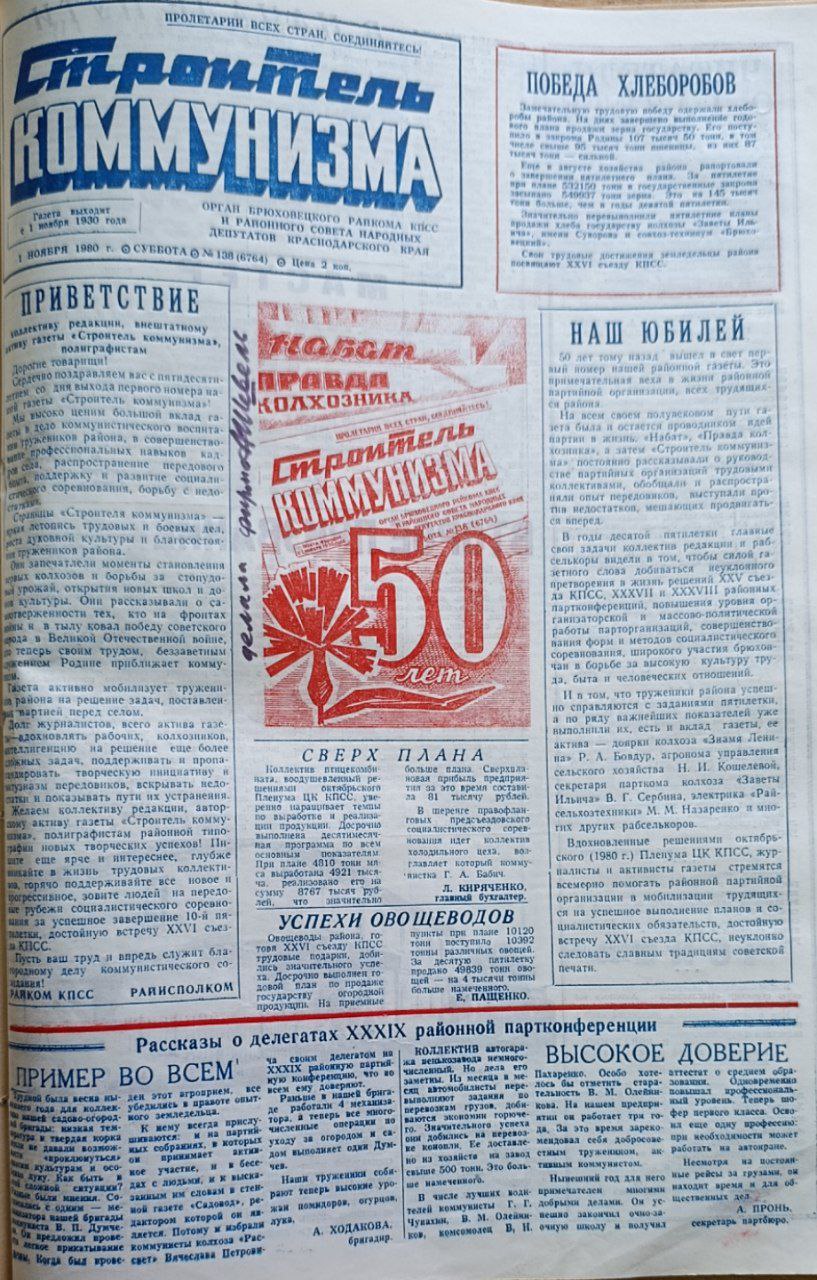 Листаем увесистый том за 1980 год. Ни в коем случае нельзя обойти юбилейный номер газеты за 1 ноября — районке исполнилось ровно полвека. Выпустили в свет газету в два цвета — синий и красный. На первой полосе яркое красочное фото с большой цифрой 50, сверху которого названия газет: «Строитель коммунизма», «Правда колхозника», «Набат». Как и водится, справа от фото размещен материал о пятидесятилетнем пути издания, а слева — поздравление коллективам редакции, внештатному активу газеты, типографии.
